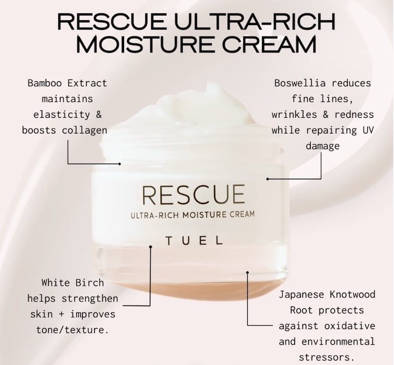 • Tuel Moisturizer: I take advantage of two manufacturers of skincare. The primary is OneSkin, it targets the senescent aska ‘zombie’ cells so your pores and skin will be more healthy and younger. OneSkin is my ‘primer’ after which I take advantage of a number of the Tuel mature pores and skin line for added peptides and different skincare properties. One in all my favourite merchandise is their RESCUE cream. Not solely does it odor divine and really feel superb in your pores and skin, simply take a look at what it’s delivering to your pores and skin!
