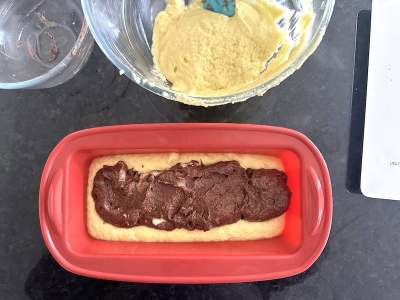 Put 1 / 4 of the batter in a separate bowl and blend within the cocoa powder. Pour half the sunshine batter right into a 2lb silicone loaf mould, no greater than 24cm x 11cm (9″ x 4″). Unfold the chocolate batter onto the centre. Prime with the remaining mild batter.