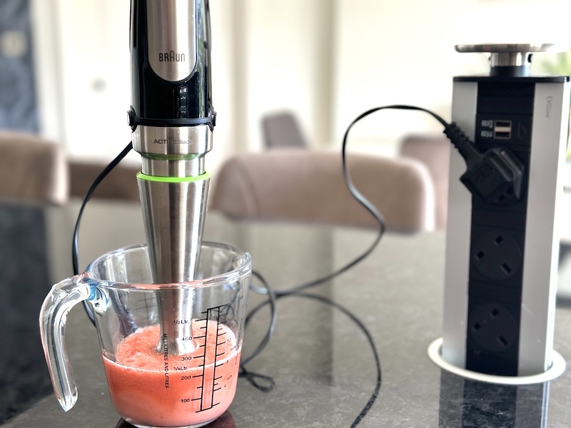 When it comes to utensils, you’ll want an electrical stick whisk, a small saucepan, and mixing bowls. When whipping, you need stiff peaks for the cream, and deep trails when you’ve added the mascarpone and strawberry compote.