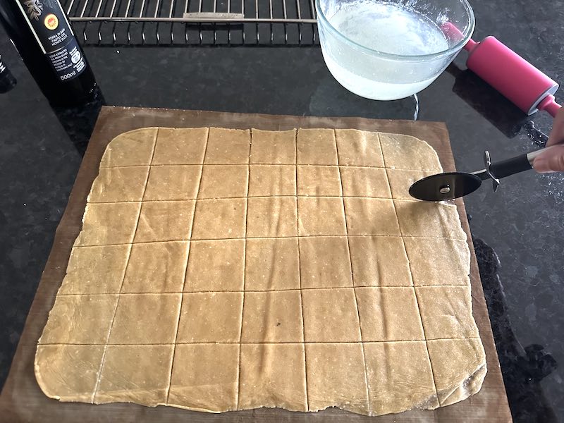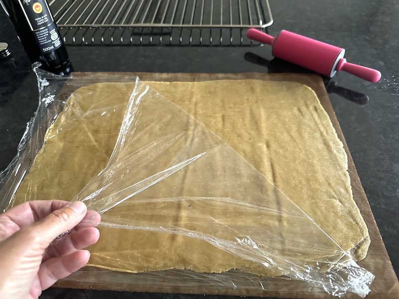 You’ll want a medium mixing bowl, a fork, a versatile silicone spatula, weighing scales, a silicone pastry sheet, cling movie (saran wrap), a rolling pin, and a pizza wheel (or knife).
